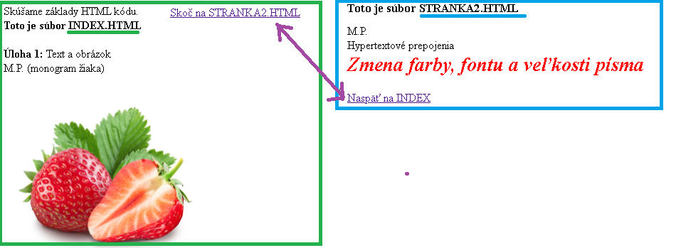 Vytvor ďalšiu jednoduchú stránku podľa vzoru, nazvi ju stranka2.html a ulož do priečinka HTML. Prepoj index.html a stranka2.html hypertextovými odkazmi. K´ód na hypertext nájdi na internete alebo použi WYSIWYG editor, napr. Kompozer.